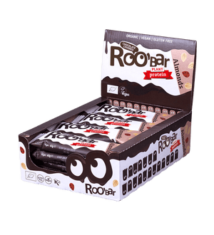 Zutaten: Kokossirup*, Schokolade* (Kakaomasse*, Kokosblütenzucker*, Kokosnusscreme*, Kakaobutter*, Sonnenblumenlecithin*) (16%), Datteln*, geröstete Mandeln* (Mandeln*, Salz) (12%), Kakaobutter*, Reisprotein* (9%), Erbsenprotein* (9%), Haselnussmus*, Kakaopulver*.