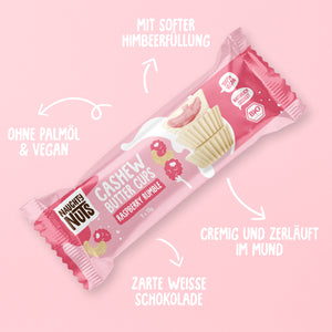 Tauche ein in die sündige Verlockung und erlebe eine unwiderstehlich cremige Himbeer-Cashewmus Füllung. Dieses schmelzende Abenteuer im Mund ist ein purer Genuss und gibt dir die perfekte Kombination aus fruchtig und süß.