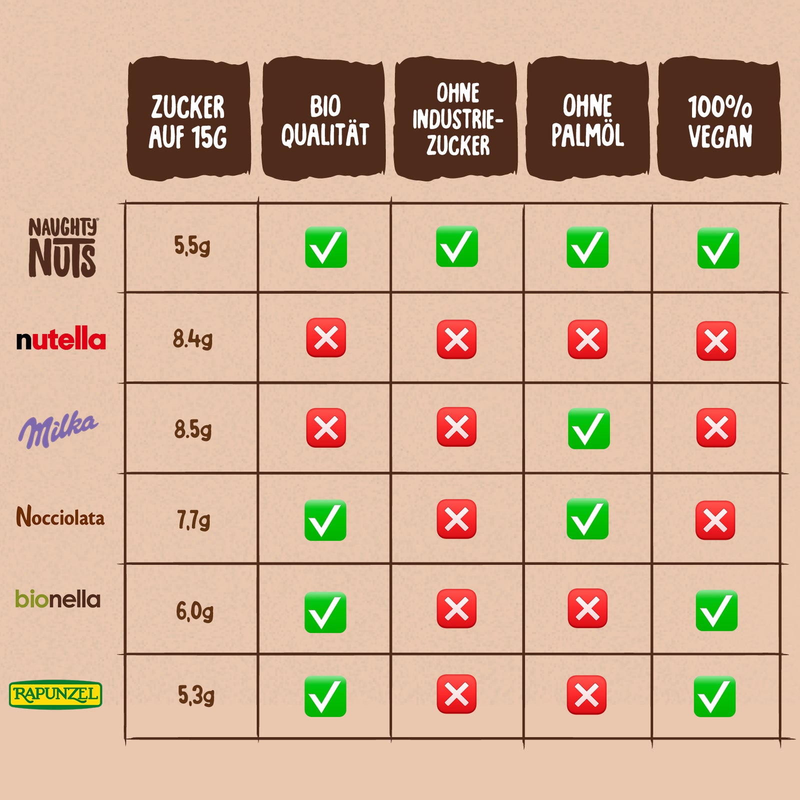 Ja, wenn nicht sogar besser! Wir haben die Zutaten von Nute**a durch gesündere und bessere Alternativen getauscht. Wir verwenden nur die feinsten Haselnüsse und Kakaobohnen und verzichten dabei nicht auf den Geschmack.